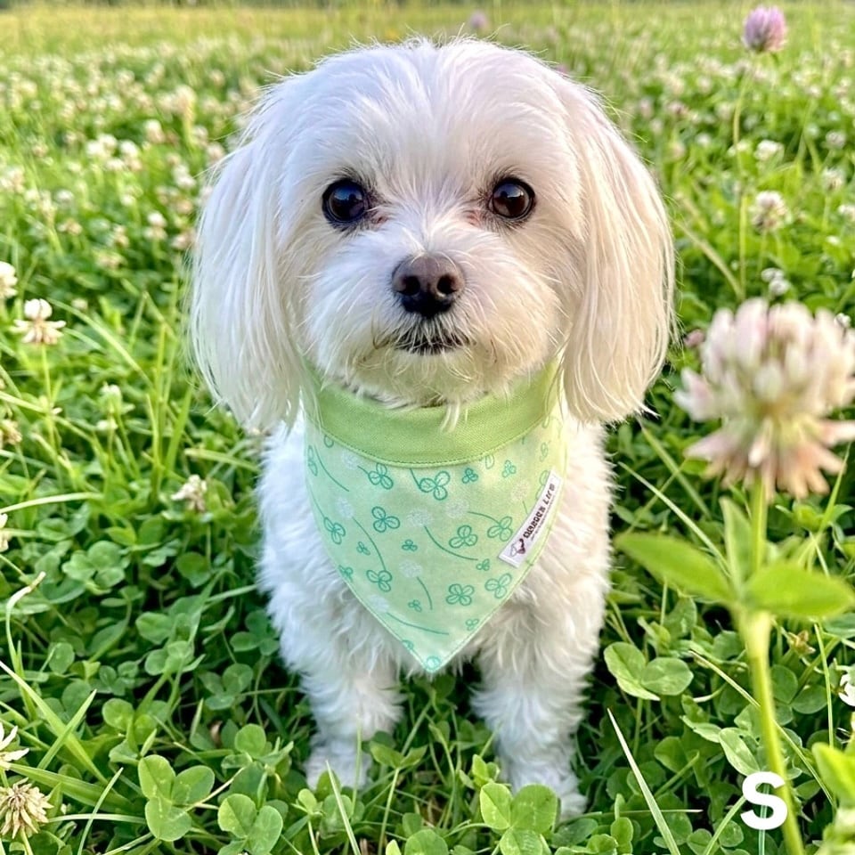 この生地のデザインはほとんど三つ葉ですが、よ〜く探してみると「四つ葉のクローバー」がありますよ!このバンダナ着けて幸せな気分で春のお散歩を楽しんで下さい。