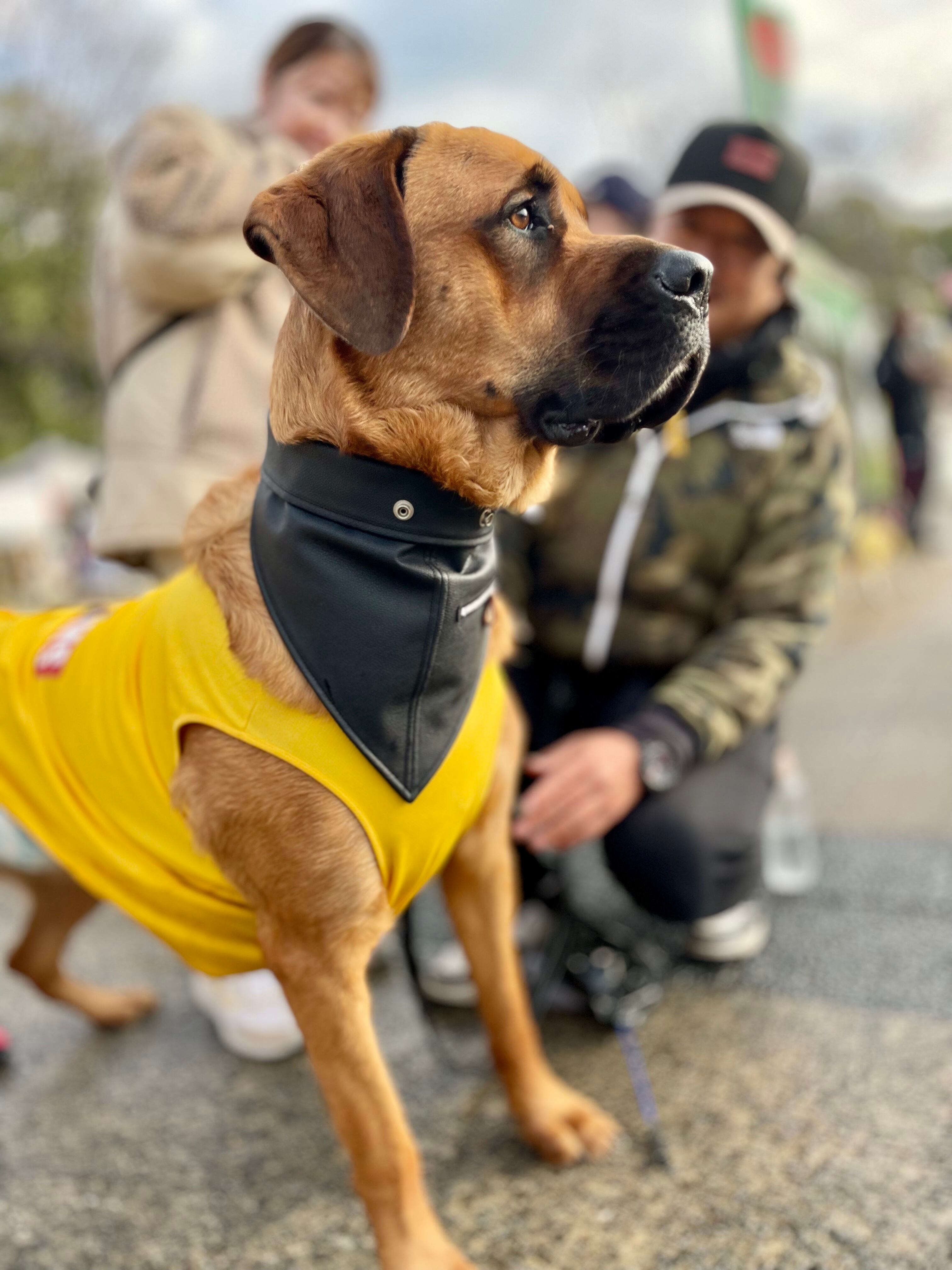 フェイクレザーにファスナーはワッペン、表のホックも飾りでホックの機能はない、全てフェイクでパロディ的ではありますが、見ての通り、ライダースジャケットを犬用にアレンジした男気ありありのカッコイイバンダナです!このバンダナ着ければ一気に男度上がります⤴️