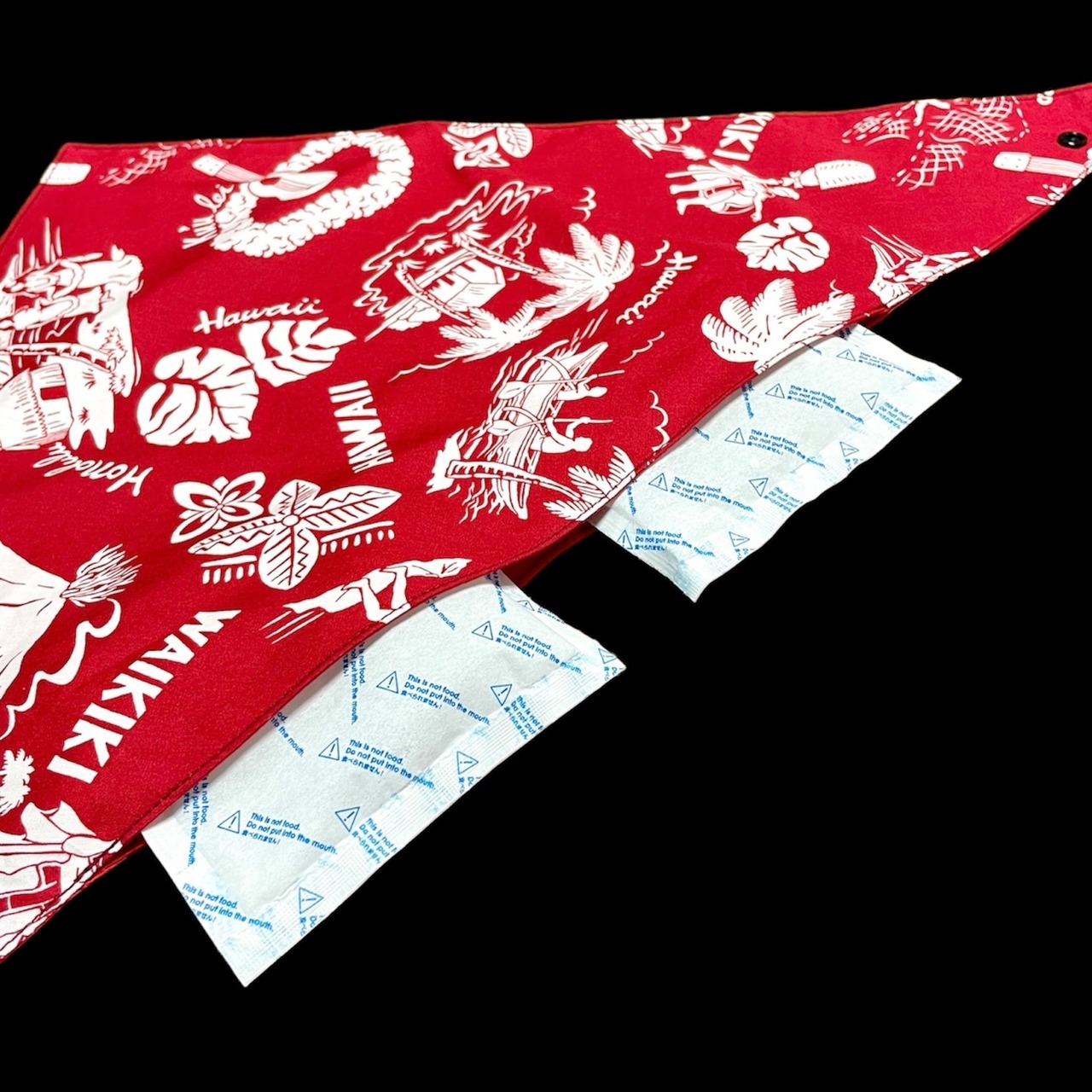 上側に保冷剤を2個入れる事ができて、首元を折り返す事で保冷剤が飛び出る事はありません。