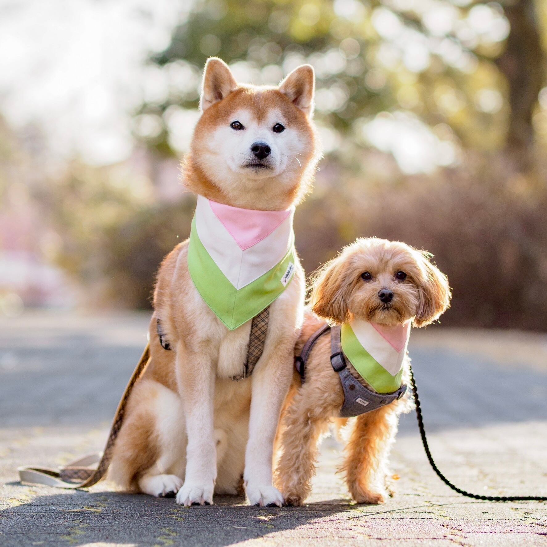 モデルは、マルプーのレオくんと柴犬の麓くんです。